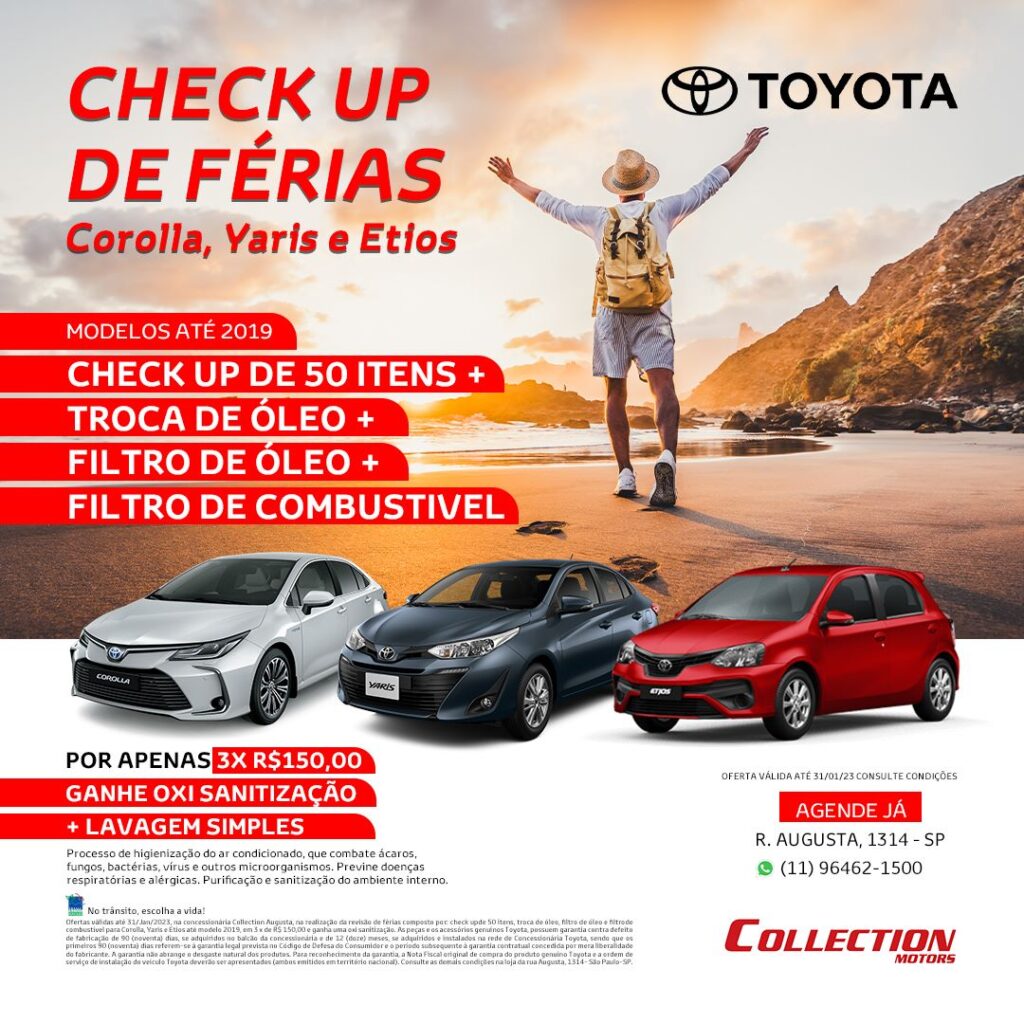 Ofertas válidas até 31/Jan/2023, na concessionária Collection Augusta, na realização da revisão de férias composto por: check up de 50 itens, troca de óleo, filtro de óleo e filtro de combustível para Corolla, Yaris e Etios até modelo 2019, em 3 x de R$ 150,00 e ganha uma oxi sanitização (processo de higienização do ar condicionado, que combate ácaros, fungos, bactérias, vírus e outros microrganismos. Previne doenças respiratórias e alérgicas. Purificação e sanitização do ambiente interno do veículo. Não utiliza nenhum produto químico). O check up é gratuito e pode gerar orçamento. Se identificarmos necessidade de troca em algum item, sua aprovação ficará a critério do cliente. As peças e os acessórios genuínos Toyota, possuem garantia contra defeito de fabricação de 90 (noventa) dias, se adquiridos no balcão da concessionária e de 12 (doze) meses, se adquiridos e instalados na rede de Concessionária Toyota, sendo que os primeiros 90 (noventa) dias referem-se à garantia legal prevista no Código de Defesa do Consumidor e o período subsequente à garantia contratual concedida por mera liberalidade do fabricante. A garantia não abrange o desgaste natural dos produtos. Para reconhecimento da garantia, a Nota Fiscal original de compra do produto genuíno Toyota e a ordem de serviço de instalação do veículo Toyota deverão ser apresentados (ambos emitidos em território nacional). Consulte as demais condições na loja da rua Augusta, 1314- São Paulo-SP.