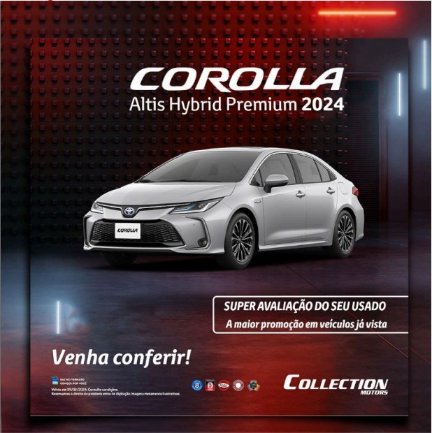 Oferta exclusiva das concessionárias Collection Toyota Augusta, Brigadeiro e Santos, válida para veículos faturados, no período de 01 a 31 de Março de 2024 ou até durarem os estoques, às pessoas físicas que adquirirem veículos Toyota à vista ou por meio de financiamento contratado na instituição financeira. Corolla Altis Hybrid Premium, com, com super avaliação do seu usado, na troca por um 0Km. PRONTA ENTREGA . Corolla Altis Hybrid Hybrid Premium Hybrid 1.8 Automático,23/24. R$ 200.910,00 à vista (frete incluso, cor metálica) ou financiado com o Banco Toyota. Corolla Altis Hybrid Premium Hybrid 1.8 Automático, abastecido com gasolina, percorre 17,9km/l na cidade e 15,4km/l na estrada e, com etanol, 11,8km/l na cidade e 10,5km/l na estrada. Veículo participante do PBEV – Programa Brasileiro de Etiquetagem Veicular do INMETRO 2022. Consulte em www.gov.br/inmetro/pt-br. Valores de referência medidos em condições-padrão de laboratório, conforme NBR 7024, e ajustados para simular condições mais comuns de utilização, podendo não corresponder ao consumo verificado pelo motorista com o uso do veículo, que depende das condições do trânsito, do combustível, do veículo e dos hábitos do motorista.