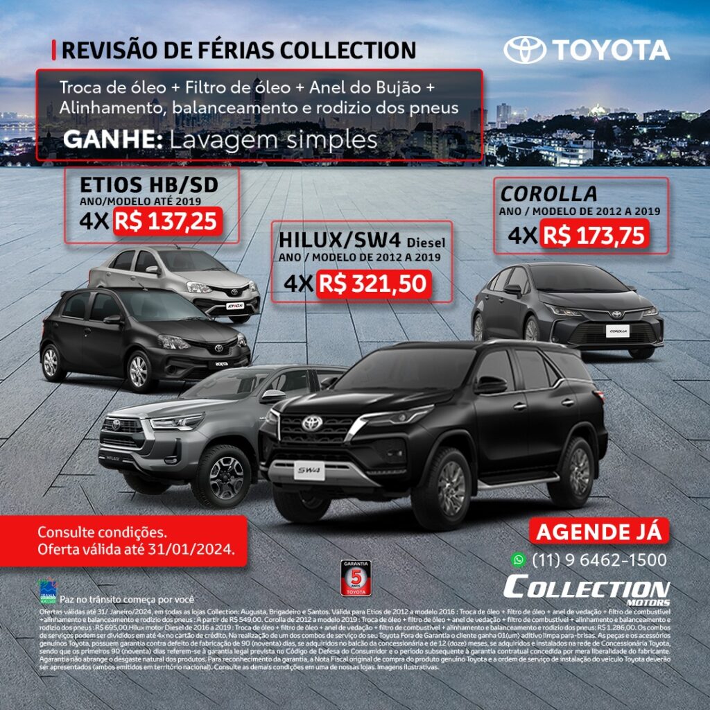 Ofertas válidas até 31/Maio/2023, em todas as lojas Collection: Augusta, Brigadeiro e Santos.  Válida para  Troca de óleo + Filtro de óleo + Anel do Bujão + Alinhamento , Balanceamento e Rodizio dos pneus. ETIOS / YARIS até ano/modelo 2019: R$ 499,00. COROLLA  ano / modelo de 2012 a 2019: R$ 599,00. HILUX / SW4 Diesel de 2012 a 2019: R$899,00. Pagamento em 3x no cartão de crédito. Lavagem simples será gratuito, mediante compra de um dos combos. As peças e os acessórios genuínos Toyota, possuem garantia contra defeito de fabricação de 90 (noventa) dias, se adquiridos no balcão da concessionária e de 12 (doze) meses, se adquiridos e instalados na rede de Concessionária Toyota, sendo que os primeiros 90 (noventa) dias referem-se à garantia legal prevista no Código de Defesa do Consumidor e o período subsequente à garantia contratual concedida por mera liberalidade do fabricante. A garantia não abrange o desgaste natural dos produtos. Para reconhecimento da garantia, a Nota Fiscal original de compra do produto genuíno Toyota e a ordem de serviço de instalação do veículo Toyota deverão ser apresentados (ambos emitidos em território nacional). Consulte as demais condições em uma de nossas lojas. Imagens ilustrativas.